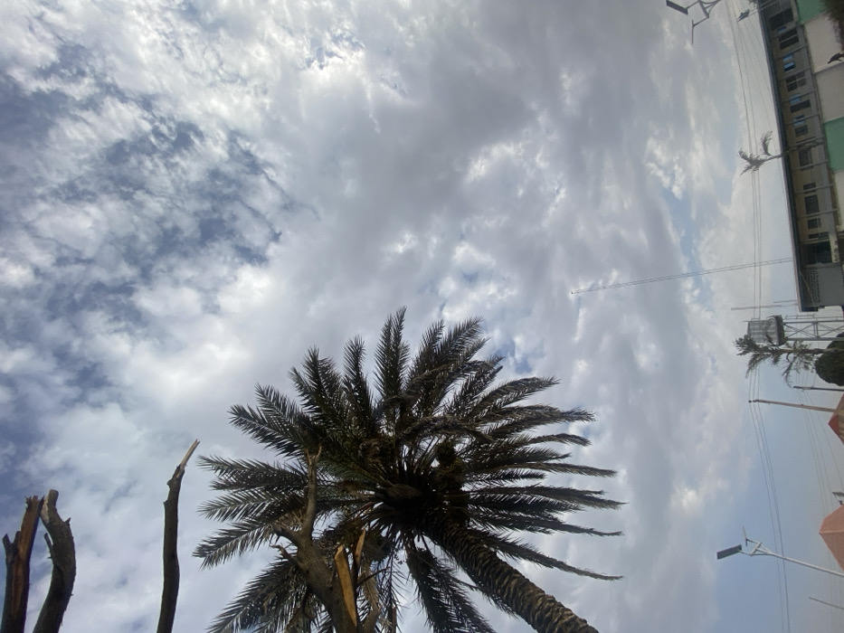 A low-angle shot focuses on a large palm tree against a backdrop of a cloudy sky. To the left, broken tree trunks reach upwards. In the distance, there's a glimpse of a building, streetlights, and power lines, all partially obscured by the cloud cover. The sky transitions from lighter hues near the horizon to darker shades higher up, creating a dramatic contrast.