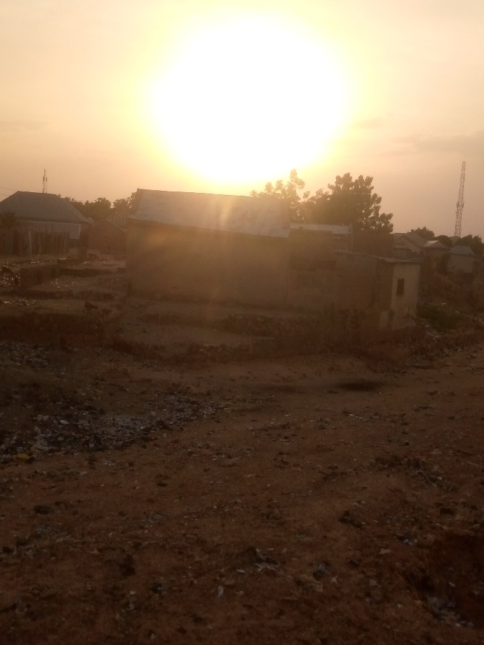 - "The image displays an outdoor scene in Pantame, Nigeria, at either sunrise or sunset, with a prominent, bright sun positioned in the upper center, generating significant lens flare and warm, hazy lighting across the sky" by FM-ER8sG3, licensed under CC BY 4.0