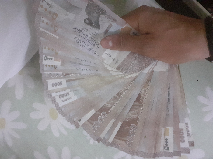 - "In Ma'raba, Syria, a close-up, high-angle shot captures an individual's right hand holding and fanning out multiple 5000 Syrian Pound banknotes" by FM-huZbG2, licensed under CC BY 4.0