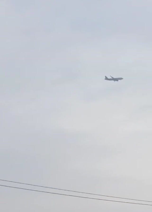plane in flight against a cloudy sky. The plane appears to be descending. In the foreground, there's a building with visible windows and a rooftop structure, as well as some power lines. Further in the distance, there's a cityscape obscured by haze or fog.