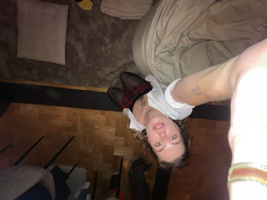 A woman with curly hair takes a selfie from above, wearing a white shirt and a red plaid skirt over sheer black tights. She has tattoos on her arm and neck. The background includes a wooden floor, a dark rug, a beige beanbag chair, and a square pillow. The image is slightly overexposed and taken at an unusual angle.