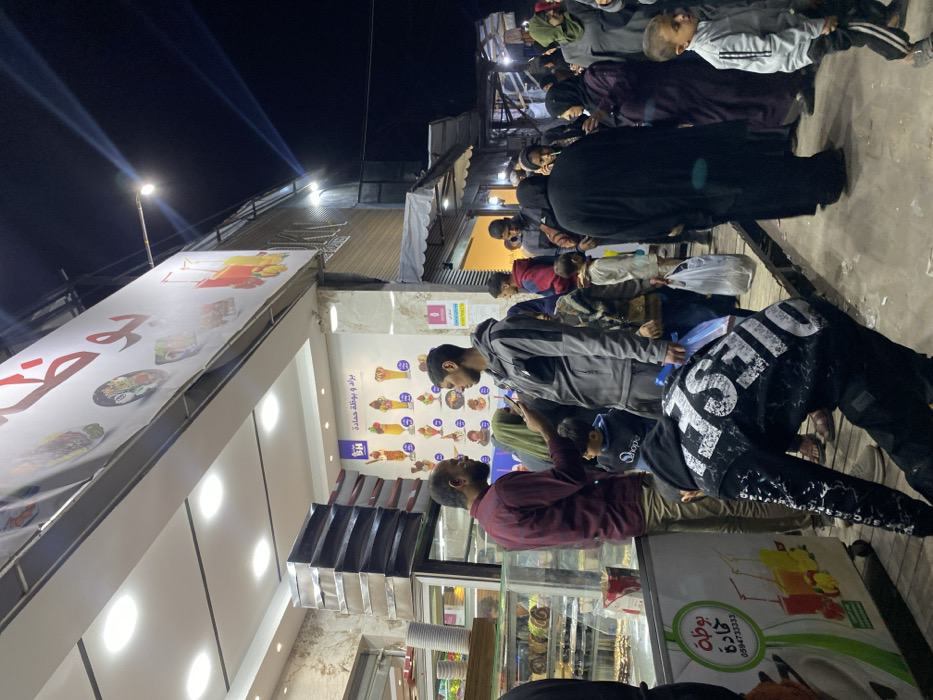 A line of people waits outside a brightly lit food establishment at night. A sign displays menu items in Arabic. Patrons, a mix of men, women, and children, wear various attire, including jackets, headscarves, and casual clothing. They appear to be ordering or waiting for food to be prepared. Streetlights illuminate the scene, casting shadows and adding to the nighttime ambiance.