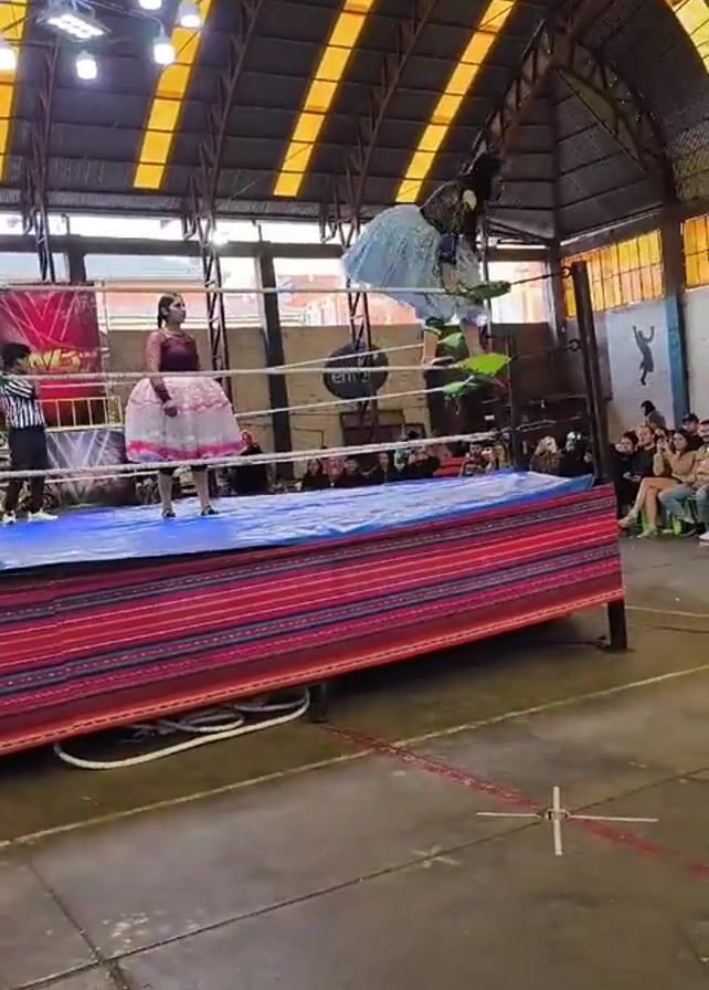 two women wrestling in a boxing ring indoors with audience seating around the ring. A referee is present. Both wrestlers are wearing traditional Bolivian dress. The women are engaging in the act of wrestling with one woman appearing to be jumping off the top rope. The boxing ring is decorated with a red, white, and blue patterned border. The environment is an indoor sports arena with overhead lighting. The audience is seated on benches.