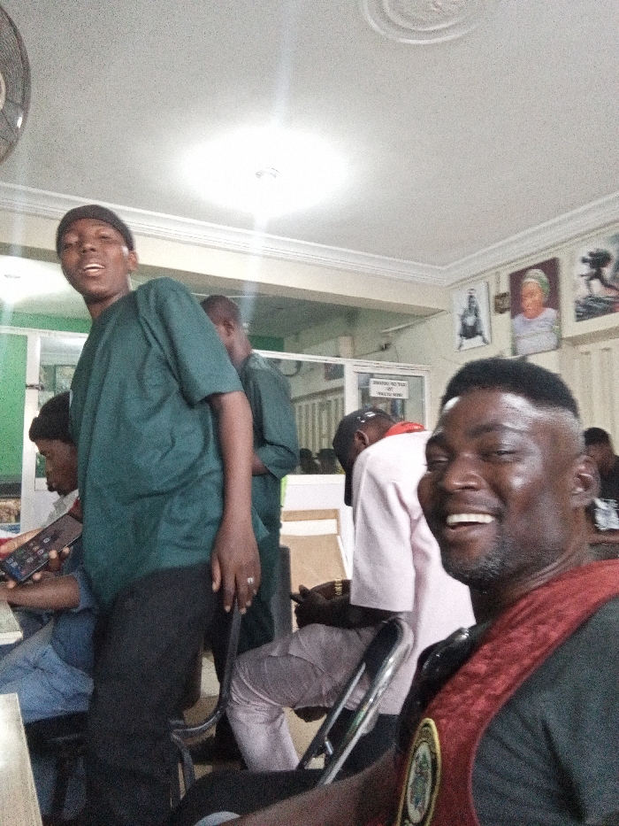 The image depicts an indoor scene in Sardauna, Nigeria, featuring multiple individuals within what appears to be a public or semi-public space, possibly an office or waiting area