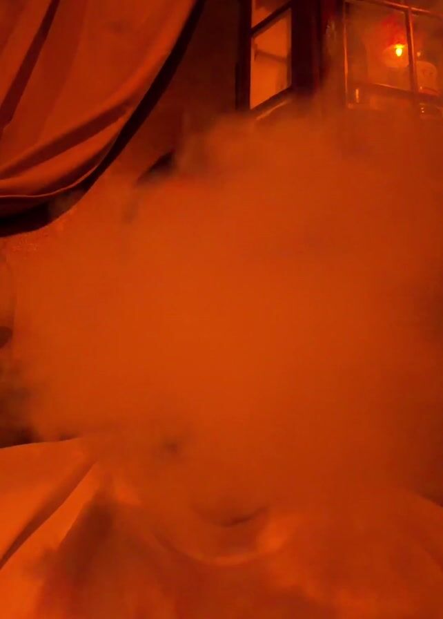 A man exhales a thick cloud of smoke directly at the camera. The scene is bathed in orange light, with a dark wooden cabinet visible behind the man on the right. The cabinet has glass doors and contains various items. To the left, a draped curtain is partially visible. The man is wearing a light-colored t-shirt.