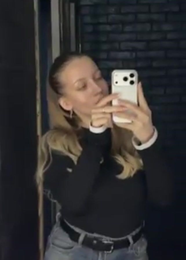 A young woman is taking a selfie in front of a mirror. She has light brown hair pulled partially back, is wearing a black turtleneck, and blue jeans with a black belt. She is holding a white smartphone in her right hand. The background is a dark brick wall. There is a door frame to the left of her, possibly a bathroom stall. The lighting is dim.