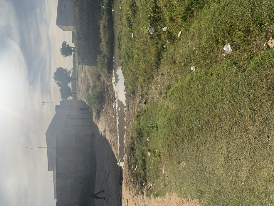 The image depicts an outdoor scene in Dabawa, Nigeria, under a bright, hazy sky. The foreground features an unkempt grassy area mixed with bare earth, littered with several white plastic bags and debris. A prominent muddy, unpaved path curves from the left foreground towards the center-right midground. Adjacent to this path, a stagnant body of muddy water, appearing as a large puddle or drainage collection, occupies the midground, also containing visible refuse. To the left, a large, rectangular, unpainted concrete or stucco building with multiple window openings dominates the middle ground. Its surface shows signs of weathering. A lone individual, dressed in dark clothing, walks from left to right across the unpaved path in front of this building. Another darker figure is partially visible near the far corner of the same building. Shadows are cast by the building and figures onto the ground, indicating direct sunlight from an elevated position. On the right side of the midground, a low wall constructed of concrete blocks or stones is visible. Beyond the immediate structures, the background reveals an expanse of undeveloped land with sparse vegetation. Several trees are scattered across this distant landscape, appearing somewhat obscured by atmospheric haze. A utility pole or similar tall structure stands vertically in the far background. Another smaller, unpainted building is visible on the far right horizon.