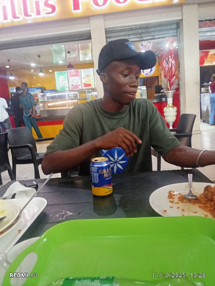 The image captures a young male seated at a dark-colored table inside Willis Fast Food in Onitsha, Nigeria. He wears a dark green short-sleeved t-shirt and a black baseball cap, and is looking towards the right with a slightly open mouth. An open blue and yellow "Grand Malt" can sits on the table in front of him, next to a white plate containing residual reddish rice and a silver spoon. His left hand holds a small blue object with a white star pattern, and a silver bracelet adorns his left wrist. In the background, the interior of the fast-food establishment is visible, featuring bright yellow walls with red "Willis Food" signage, display cases containing various food items, red pendant lights, and several dark-colored chairs. Other individuals are present in the background, including one person in a dark uniform with a shoulder bag. A green plastic tray is partially visible in the bottom foreground. The scene is well-lit. The image bears a "REDMI A3" watermark and a timestamp of "11/10/2025 13:28".
