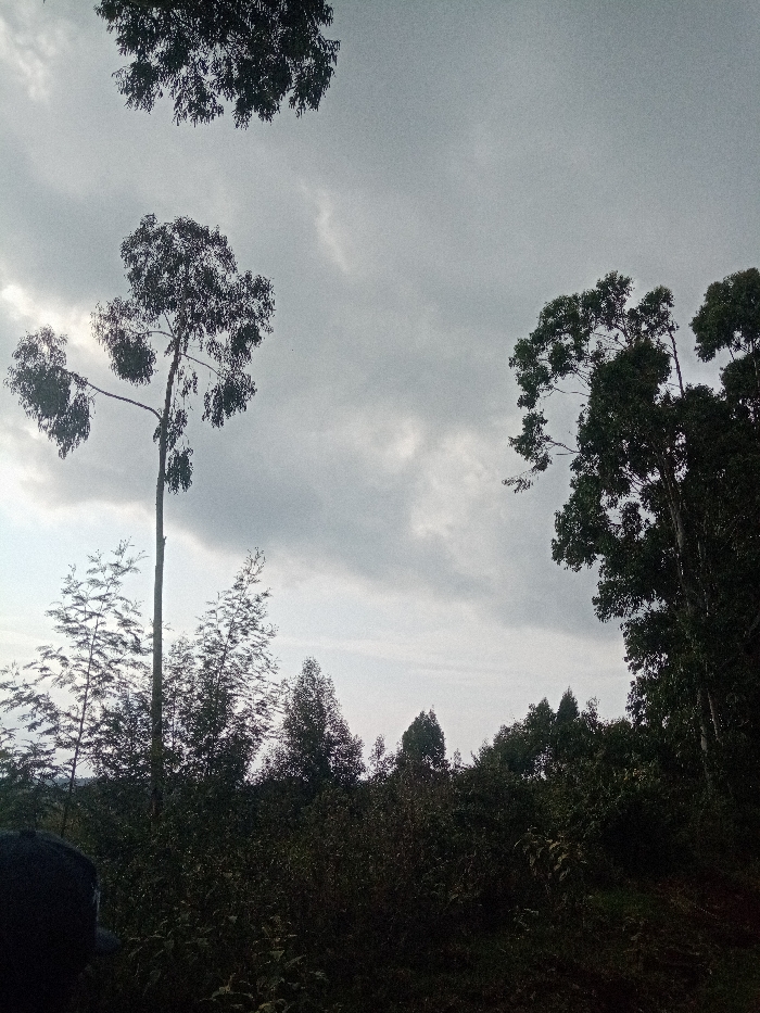 The image depicts a wooded area in Ndeiya, Kenya, under an overcast sky. The sky, covering approximately the upper two-thirds of the frame, is light grey with visible cloud formations. Numerous trees populate the scene, predominantly dark green to black against the lighter sky due to backlighting or low light conditions. In the left-center, a tall, slender tree with sparse foliage concentrated near its upper branches stands prominently. To its immediate left and slightly behind it are several smaller, thinner trees with fine, feathery leaves. The right side of the frame features taller, denser trees, with their canopies filling a significant portion of the mid-ground and upper right. A segment of another tree's canopy is visible in the upper-left corner. The lower third of the image is dominated by dense, dark green to brown vegetation, consistent with shrubs, bushes, and undergrowth, obscuring the ground. An indistinct, dark, rounded shape, consistent with the back of a human head or shoulder, occupies the bottom-left corner of the frame. No other people, objects, or actions are clearly discernible. The overall lighting suggests an overcast day, possibly early morning or late afternoon.