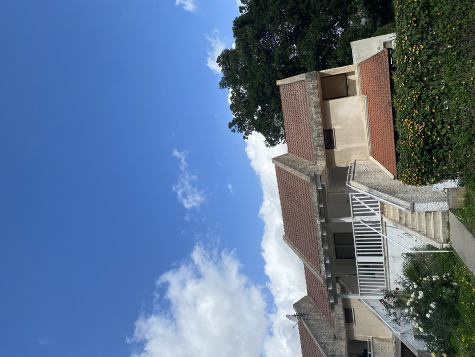 The image depicts a series of attached, multi-level residential units located within the Megido Regional Council, Israel, under a blue sky with scattered white clouds. The structures feature light beige stucco exteriors and terracotta-tiled pitched roofs with prominent concrete overhangs. Each unit is accessed via external concrete staircases equipped with white railings. The central unit presents a white-railed porch or balcony with a sliding glass door. The leftmost unit includes a small balcony and a white satellite dish mounted on its roof. The rightmost unit has an upper-level window with a closed exterior roller shutter, and its lower section is obscured by a dense green hedge displaying yellow blossoms. Green foliage, including white rose bushes, grows at the base of the central unit's staircase. A large, dark green tree is visible behind the structures on the right. No people are visible.