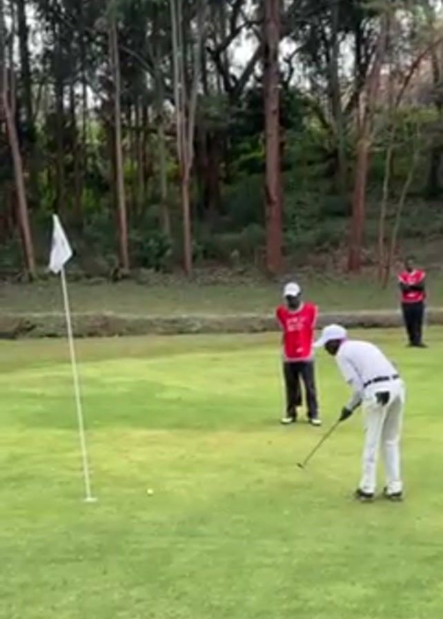 The scene is a golf course with green grass and tall trees visible in the background. There are three people on the green. The person closest to the camera is wearing white pants, a white shirt and a white baseball cap. They are putting a golf ball toward the hole, which has a white flag. A person in a red vest stands behind them, to the left, holding what appears to be a camera. Behind the person in the red vest is a third person, wearing a red jacket and black pants. As the golfer bends down to retrieve the ball, a person in a pink outfit comes into view from the right and is also seen putting a golf ball.