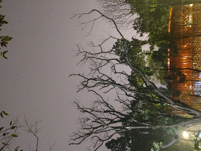The image depicts a nighttime outdoor scene in the city of Unknown, Unknown. An overcast, uniformly grey sky dominates the upper portion of the frame, with scattered green leaves from unseen foliage visible at the top edge. The foreground and midground are occupied by multiple deciduous trees exhibiting bare, dark, and gnarled branches. Behind these trees, a distinct curvilinear building is situated. Its facade is constructed from a light-colored material, likely wood, arranged in an interwoven or lattice-like pattern. The structure is internally illuminated, emitting a warm orange-yellow glow that diffuses through its patterned exterior. Denser green foliage from evergreen trees surrounds and partially screens the building. An artificial light source, possibly a streetlight, is partially visible in the lower-left quadrant, emitting a white-yellow glow. No individuals or discernible actions are present within the scene.