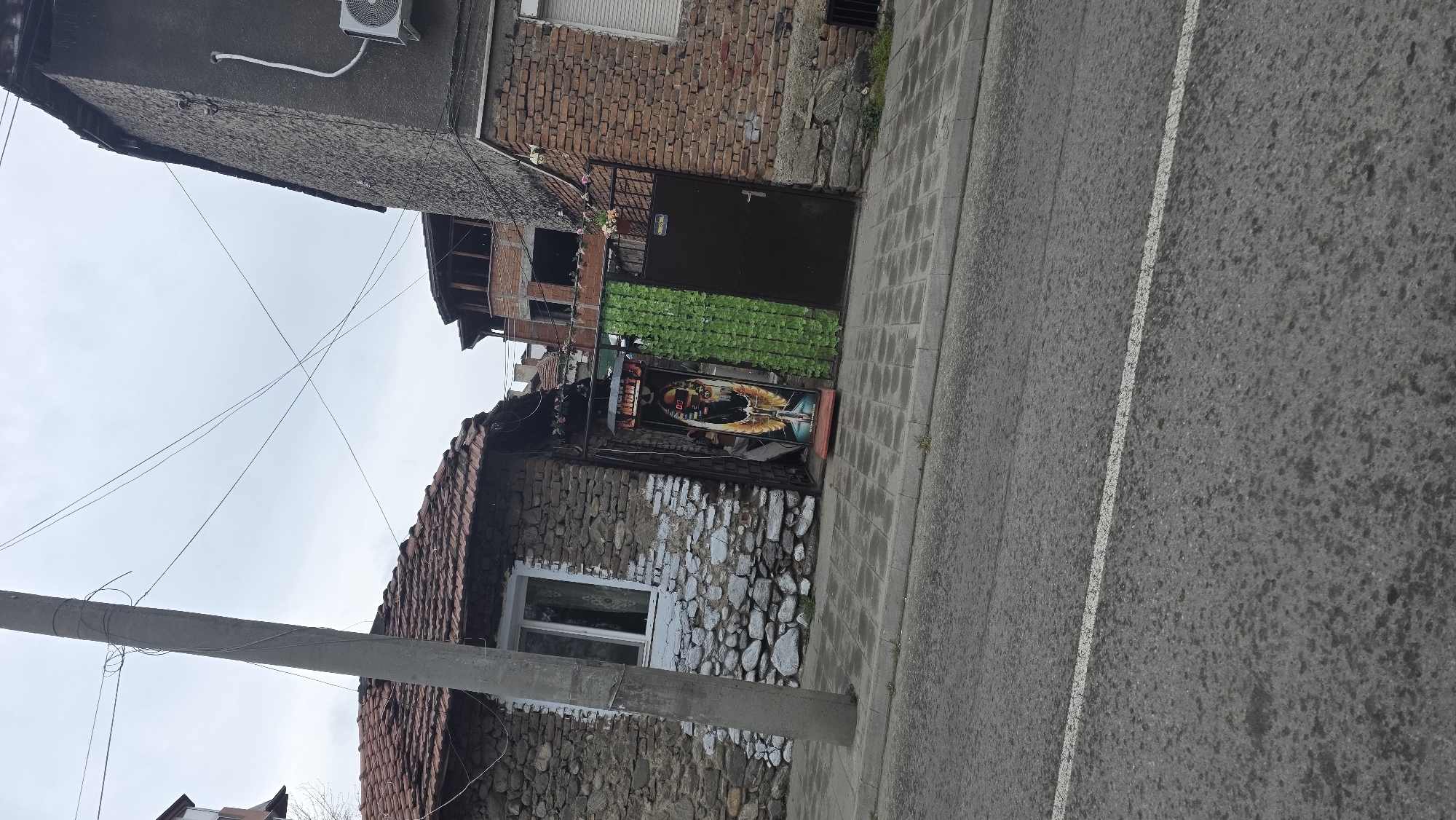A street scene in Blagoevgrad, Bulgaria, shows an asymmetrical, aging building facade on the left. The building is primarily constructed of rough-hewn stones and mortar, with a single window near the center. A weathered roof with reddish tiles sits atop the structure. Next to the building on the right is a passage or entry, marked by green artificial foliage that obscures a portion of a dark, potentially metal gate. An advertising sign, possibly for "Night Light", is prominently displayed near the entrance. Adjacent to the building and entrance is a concrete sidewalk and asphalt road with a white line marking lanes. Overhead electrical wires crisscross the sky. A light gray, overcast sky provides the backdrop. A concrete light pole is also visible.
