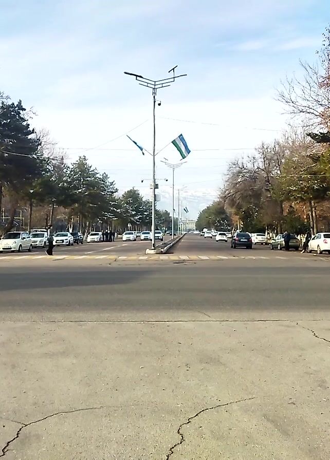 The scene is a view of a city street, presented upside down. A road with visible cracks runs along the top of the frame. Below the road, there is a row of parked cars on either side of the street, trees lining the sidewalks, and buildings in the background. A flag of Uzbekistan is suspended in the middle of the street. A billboard is visible on the left side. There is a person walking along the sidewalk. The sky is light blue with some clouds.