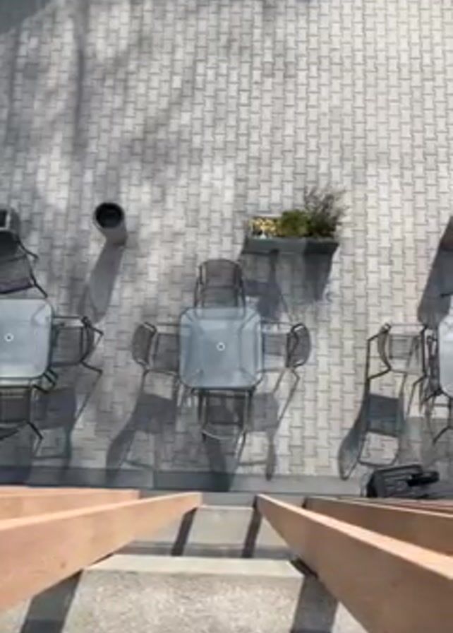 n overhead view of an outdoor seating area from the perspective of a balcony or elevated platform. The ground is paved with grey interlocking bricks. Three sets of outdoor tables and chairs are evenly spaced across the patio. Each set consists of a square glass-topped table surrounded by four black metal chairs. A grey cylindrical trash can is positioned beside each table set. A rectangular planter box filled with green plants sits between the center and rightmost table sets. A white painted parking line is visible near the top of the frame. The camera view is obstructed by the brown wooden railing of the balcony or platform from which the video is shot. There are no visible people.