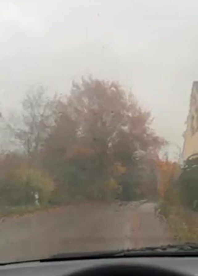 The view from inside a car looking through the windshield reveals a rainy autumn day. A tree with reddish leaves and another bare tree are visible across a wet road. A building is partially visible on the right. The windshield wipers are not in use.