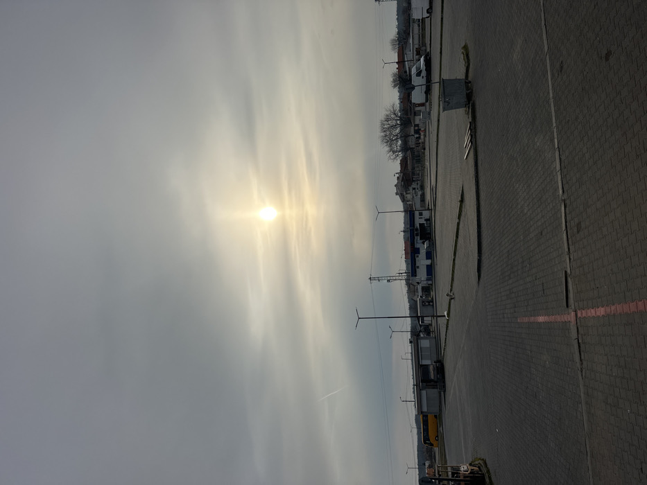 This image depicts a wide-angle view of a large, paved parking or bus terminal area in Plodovitovo, Bulgaria, under an overcast sky. The sun is visible as a bright, central disc with a prominent vertical flare, positioned in the upper-mid section of the frame. A faint white contrail extends diagonally in the upper-left quadrant of the sky. The ground is composed of grey interlocking pavers, with a singular red painted line running from the foreground towards the midground. Several dark grey, modern-style streetlights, each with two parallel light sources, are evenly spaced across the paved area. In the midground, towards the right, a large, grey, wheeled industrial dumpster is present. The background features various structures and vehicles: * On the far left, a yellow bus is parked. * To its right, a low-rise, single-story building is visible, with a dark-colored utility truck or similar vehicle parked in front of it. * Further right, a larger building with blue and white sections, potentially a commercial or service station, stands. * Several bare deciduous trees are visible beyond these buildings, silhouetted against the sky, indicating a lack of foliage. * On the far right, a white commercial van and another partially obscured white vehicle are parked. * Utility poles and overhead power lines are visible throughout the background area. No individuals are visible in the scene. The vehicles are stationary. The lighting suggests daytime with significant cloud cover.