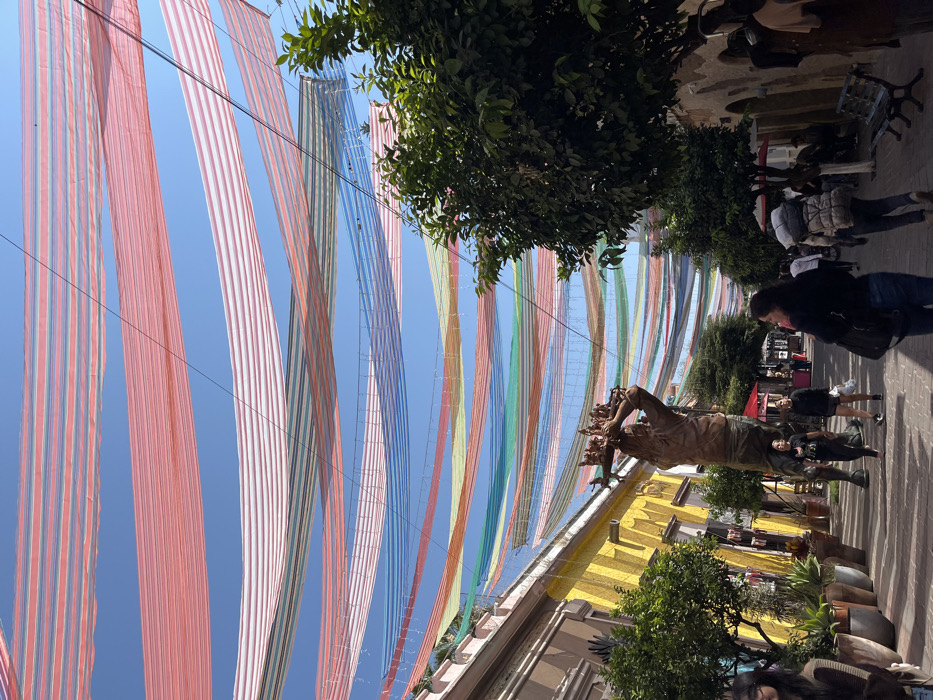 A street is decorated with colorful fabric strips hanging overhead, creating a vibrant canopy against the blue sky. People walk along the sidewalk lined with buildings and trees. A statue stands near the center of the street, surrounded by greenery. The scene is well-lit with natural sunlight.