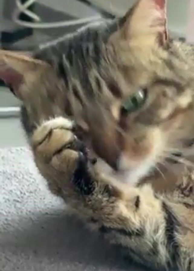 A brown tabby cat is lying on a gray surface. It is grooming itself, licking its paw and then using the paw to clean its face. The cat has green eyes and long whiskers. The background is slightly out of focus, showing a blurred white surface.