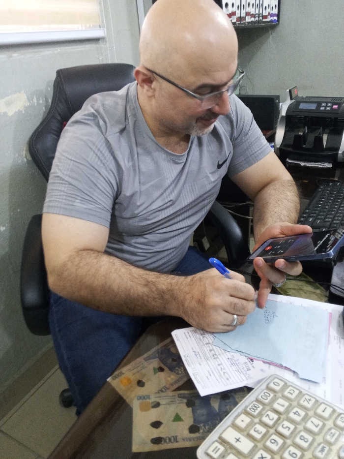 An individual is depicted seated at a desk in an office environment within Dakata, Nigeria. The bald man, wearing a grey short-sleeved t-shirt with a Nike logo and blue jeans, is positioned in a black office chair. He holds a blue ballpoint pen in his right hand, writing on a light blue piece of paper. His left hand holds a dark-colored smartphone displaying a calculator interface. On the desk, several Nigerian 1000 Naira banknotes are visible, along with additional papers and a large white calculator. A black computer keyboard is partially visible to the right. In the background, a black money counting machine, a computer monitor, and shelves containing white and red binders are present. The room's walls are grey, exhibiting some visible wear and discoloration.