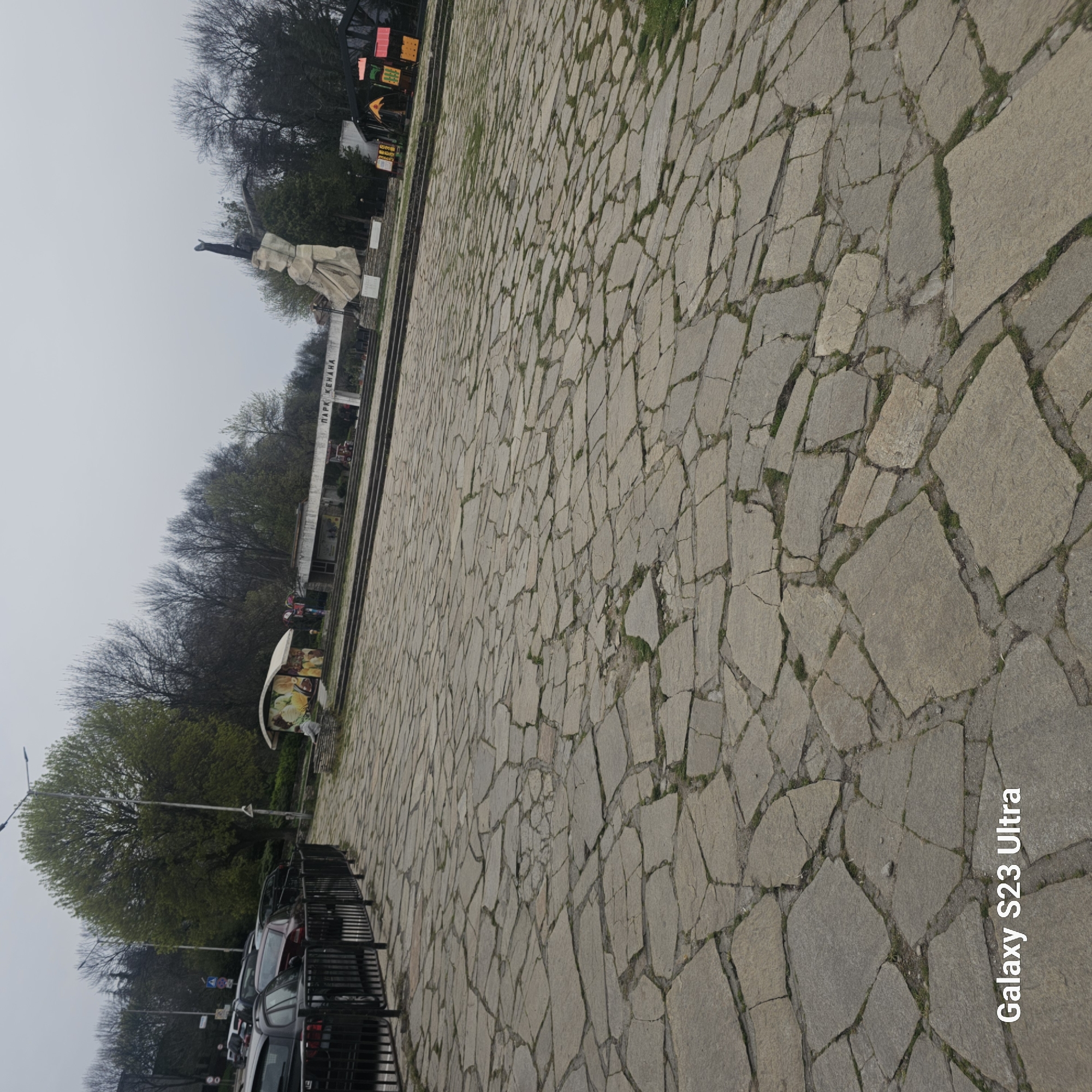 The image depicts a stone pathway leading towards the "Park Kenana" sign and a statue in Haskovo, Bulgaria. The pathway is made of irregular stone slabs with grass growing in the gaps. In the background, there are trees and a line of parked cars behind a metal fence. The weather appears overcast.