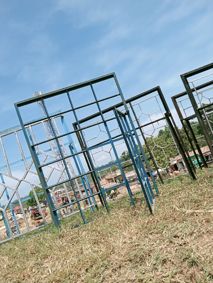 The image displays an outdoor scene in Ngenyilel ward, Kenya, under a clear blue sky. In the immediate foreground, the ground consists of dry, patchy grass and bare earth. Several large, rectangular metal frames are standing upright, angled across the frame. These frames, consistent with window or door grilles, vary in color, appearing blue, bare silver-grey metal, and dark brown/black, and feature internal grid patterns, some with hexagonal and others with square divisions. Through and beyond these metal structures, a populated outdoor area is visible. Numerous individuals are present, appearing to be adults, engaged in activities such as walking, standing, and interacting. The background reveals basic structures, some with corrugated iron roofs, and various objects on the ground indicative of a market or construction site. On the far left in the background, a tall, grey metal lattice tower is visible. Green trees and additional distant buildings are also discernible further back.