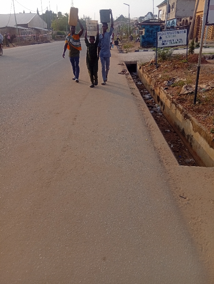 Three people walk down a paved street, each carrying a container on their head. The person on the left wears a patterned orange and blue shirt, the middle person is in dark green, and the person on the right wears light gray. A drainage ditch filled with debris lines the right side of the road. Buildings and trees are visible in the background. The scene appears to be in a residential or commercial area with a clear sky above.