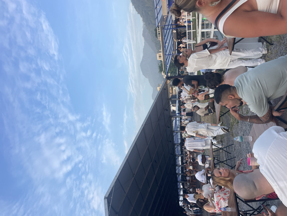 The image depicts an outdoor social event in Rio de Janeiro, Brazil, likely situated at the Jockey Club Brasileiro in Gávea, evidenced by the distinctive two-towered building and lush green mountains in the background. The scene is illuminated by natural daylight under a blue sky with scattered clouds. A large gathering of approximately fifty individuals, predominantly adults, is distributed across a gravel and dirt surface. A significant portion of the scene is covered by a large, grey temporary event tent, with its internal structure visible. Additional structures with blue accents are visible in the mid-distance. In the foreground, multiple individuals are seated at small, square wooden tables with folding metal legs. On the right, a bearded man with visible tattoos on his right arm, wearing a light green t-shirt, is seated, resting his chin on his hand. Opposite him, another person wearing a white t-shirt is seated with their back to the camera. On the left, a blonde woman in a pink top is seated, looking towards the right, with a pink cup and a clear plastic water bottle on her table. A woman in a white and red floral dress is seated next to her. In the midground, numerous individuals are standing and walking. Many attendees in the midground and background are dressed in white or light-colored clothing. A man in a white striped shirt walks away from the camera. A dark-haired man in a dark shirt stands holding a book or menu. To his left, a man and a woman, both in white attire, stand close together near a white wooden fence. People are observed socializing and moving through the event space.