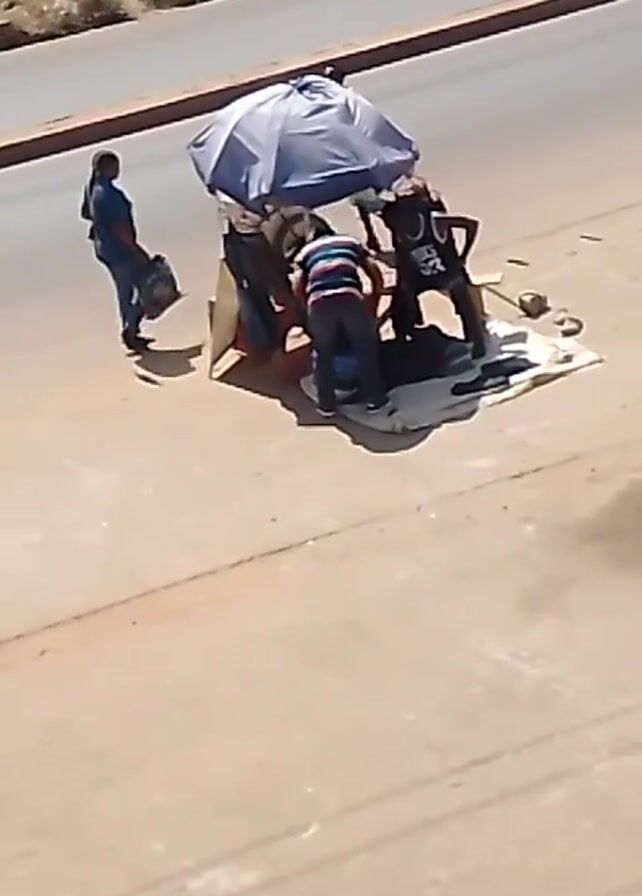 A small group of people are gathered around a makeshift table and umbrella on the side of a road in what appears to be a warm, sunny location. There are three individuals standing under the umbrella and another standing to the side. One appears to be working, possibly repairing shoes, judging by the tools and items on the ground. A woman walks toward the group carrying a bag. Vehicles, including a black car, a yellow van, and a motorcycle, pass by on the road. A person pulls a white cart down the road behind the group. The setting seems to be a somewhat busy roadside area.
