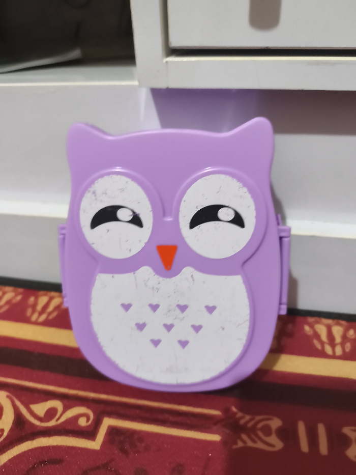 A lavender, owl-shaped container sits on a red and gold patterned surface. The owl has white circles for eyes with black pupils and a small orange triangle for a beak. The owl's chest area is also white, adorned with small purple heart shapes. The container appears to be made of plastic and shows signs of wear, with some smudges and scratches on the surface. A white cabinet is visible in the background.