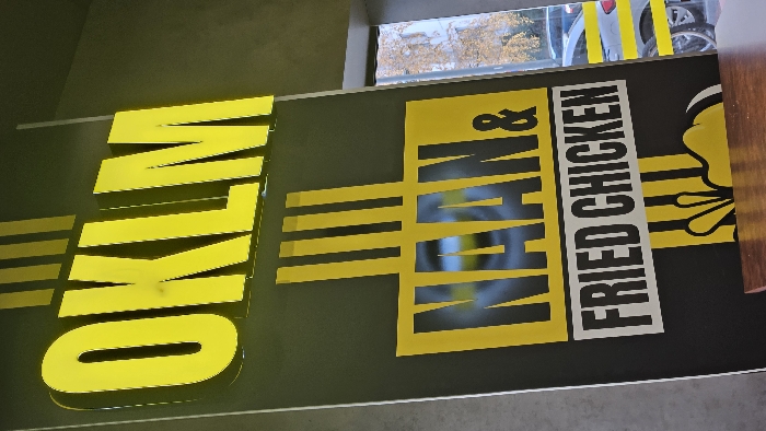 A signboard displaying "OKLM" in large, yellow, illuminated letters on the left. To the right are yellow horizontal stripes leading to a graphic with the text "MEAN & FRIED CHICKEN," with the words stacked vertically. The color scheme is primarily black, yellow, and white. The signboard appears to be indoors and near a window.