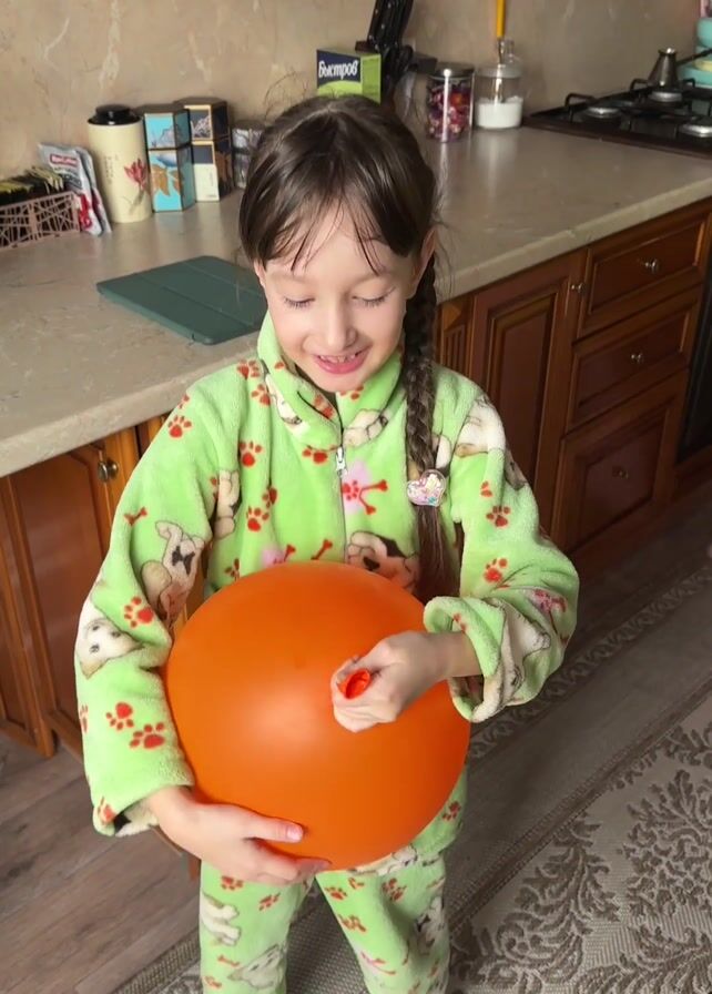 A young girl is standing in a kitchen in front of wooden cabinetry, holding an orange balloon