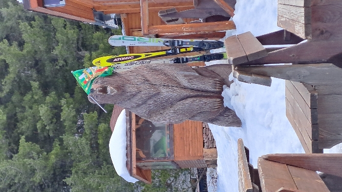 This image depicts a snowy outdoor scene in Govedartsi, Bulgaria. A large, brown, carved wooden bear statue stands upright centrally, featuring textured fur and an open, roaring mouth. A green, white, blue, and red flag with multiple symbols is draped over the bear's left shoulder. Two pairs of skis are propped against the bear's right side: one yellow and black pair branded "ATOMIC" and "FISCHER," and one white and light blue/green pair branded "ROSSIGNOL." The ground is covered with a thick layer of white snow. In the midground to the left, a wooden gazebo-style structure with a snow-covered brown roof and transparent window panels is visible. The background is dominated by a dense coniferous forest. On the right, a portion of a larger wooden building is present, and in the immediate foreground, sections of wooden picnic tables or benches are visible on both the left and right sides.
