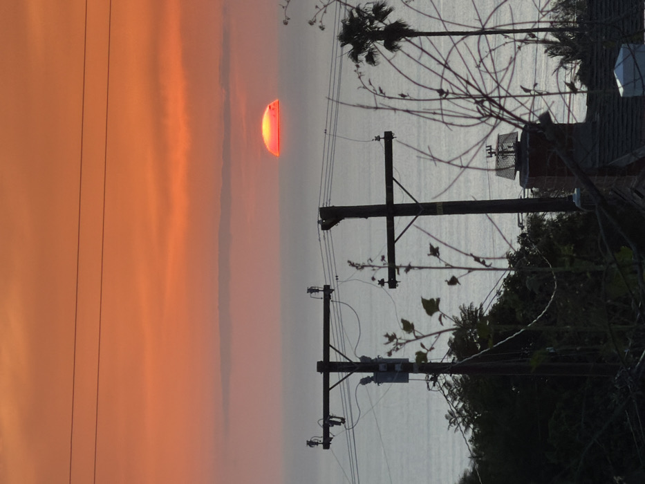 An orange sunset colors the sky behind power lines and poles. The sun is a semi-circle shape, possibly due to setting. Ocean water stretches horizontally between the sky and foreground. Palm trees and other vegetation appear on the right side of the frame. A rooftop is also visible. The photograph is taken from a low angle and rotated 90 degrees.