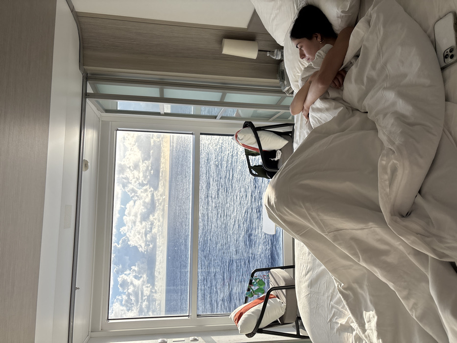 The image displays the interior of a modern cabin, likely on a cruise ship, with a panoramic view of the open ocean. The location is at sea; no specific city or landmass, including any in the Bahamas, is visible. A female individual, with dark hair, lies reclined in a bed covered with white bedding, appearing to look upwards and slightly right, with her arms crossed under the covers. A light-colored smartphone rests on the bed near her hip. To the right of the bed, a bedside table holds a beige cylindrical lamp and a plastic water bottle. Two contemporary chairs with dark frames, light cushions, and orange accents are positioned facing the large window. A small white table stands between these chairs. Two green bottles are suspended from the backrest of the left chair, and a dark bag is visible on the right chair. The expansive window overlooks a blue, wavy ocean under a partly cloudy sky, with bright sunlight reflecting on the water.