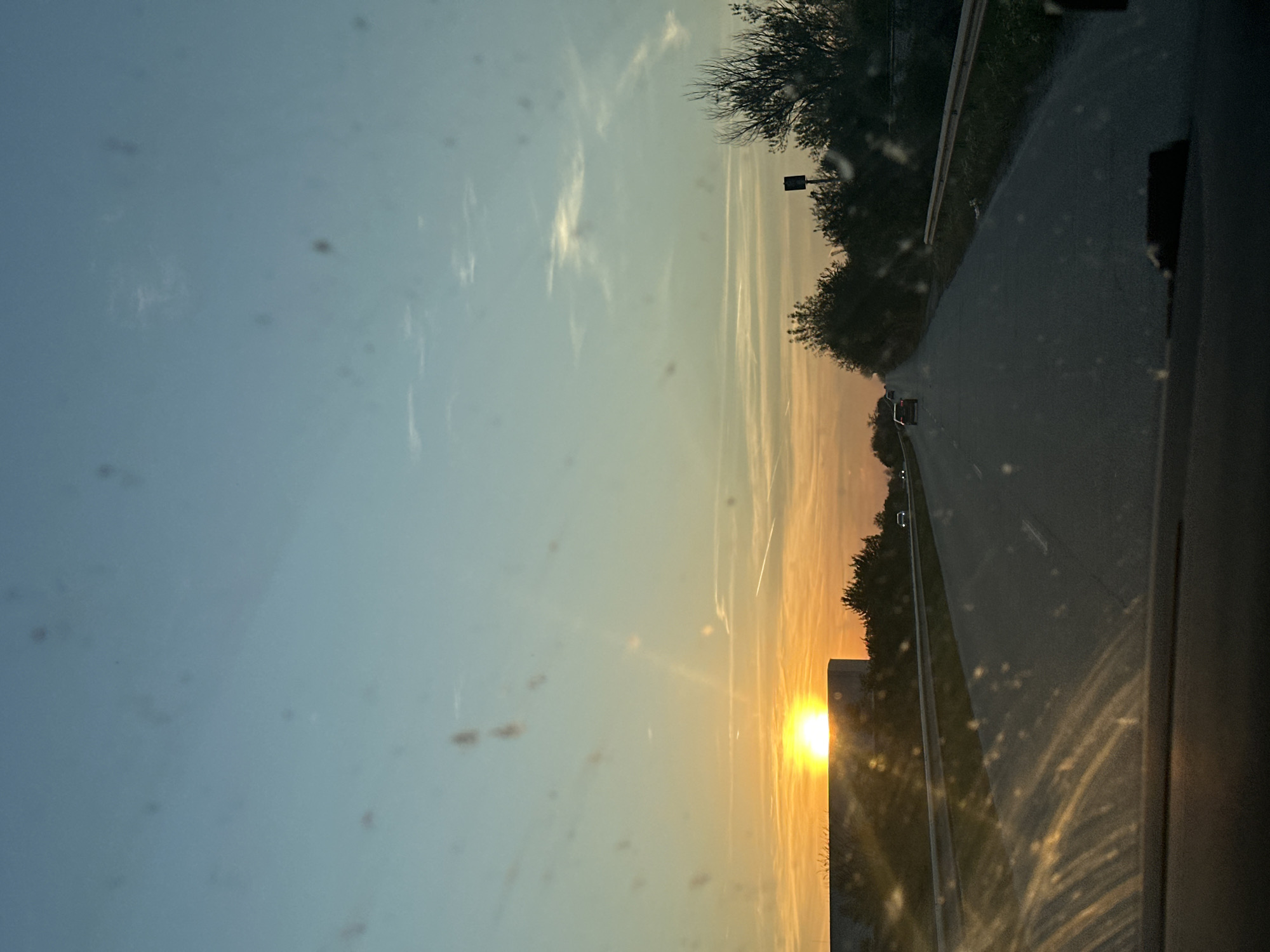 The image depicts a sunset viewed from inside a car driving on a road