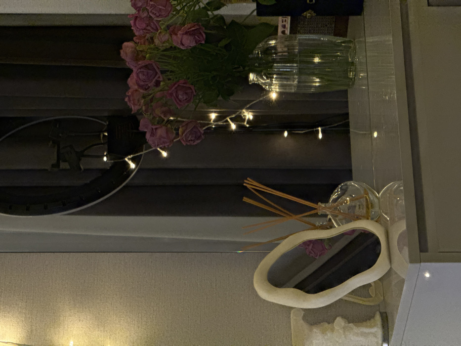 The image displays an interior vignette on a glossy, light gray furniture surface. A white, organically shaped mirror stands on the left, reflecting a pink rose. Adjacent to it, a clear glass diffuser contains a yellowish liquid and several light brown reed sticks. Behind these objects, a dark curtain is visible, against which hangs a large, black circular object, possibly a ring light, accented by a string of warm white fairy lights. A clear, ribbed glass vase filled with water holds a bouquet of withered pink roses and green foliage, also illuminated by the fairy lights. A dark blue object with a metallic clasp is partially visible on the far right of the surface. The background wall on the left is light-colored and textured, featuring a vertical strip of warm white fairy lights. The scene provides no discernible geographical markers to pinpoint a specific location within the city of Tbilisi, Georgia.