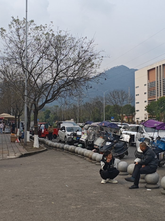 A street scene shows cars, scooters, and motorized tricycles parked on one side. Stone spheres line the street, separating the parking area from the pedestrian space. Two people sit on these spheres, one squatting and the other sitting upright. A bare tree stands on the left, and a large building is visible on the right, with mountains in the background. The sky is overcast. People walk on the sidewalk in the distance.