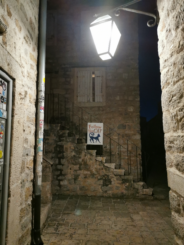 A narrow alleyway is illuminated by a bright lamp hanging above. Stone walls enclose the path. A staircase leads up to a building with weathered window shutters. A sign reading "Follow the CAT" with a blue cat silhouette is visible near the stairs. The alley floor is paved with stone bricks, and a dark passage can be seen at the end of the alley. A metal pole stands to the side, adorned with stickers.