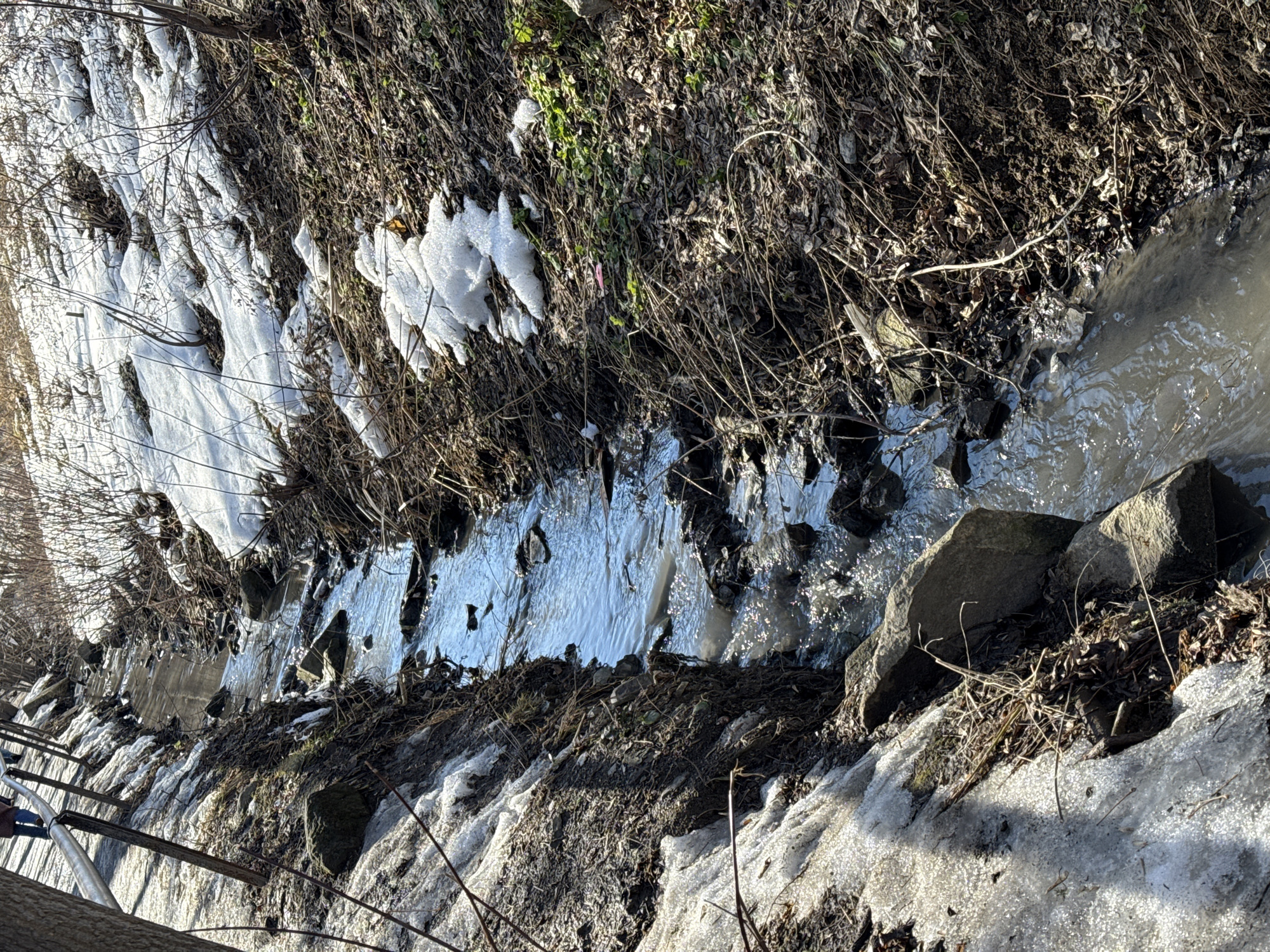 The image captures an outdoor scene in Yekaterinburg, Russia, depicting a narrow, shallow stream flowing through a partially snow-covered natural area during late winter or early spring. The stream, oriented diagonally from the upper left to the lower right, contains visible rocks in its bed and exhibits both clear, reflective water and murkier sections. To the left of the stream, an elevated pathway is present, bordered by a metal handrail supported by vertical posts. This path is covered in melting snow and exposed soil. Two individuals are partially visible walking on this path in the upper left quadrant, with only their lower bodies and legs discernible. A tree trunk partially obstructs the view on the far left. The right side of the stream features a sloping bank covered extensively with melting snow, desiccated brown leaves, bare branches of deciduous shrubs, and emerging patches of green foliage. A small, bright pink object, consistent with discarded litter, is visible on this bank among the vegetation. Sunlight casts distinct shadows and creates glints on the water's surface, indicating clear weather.