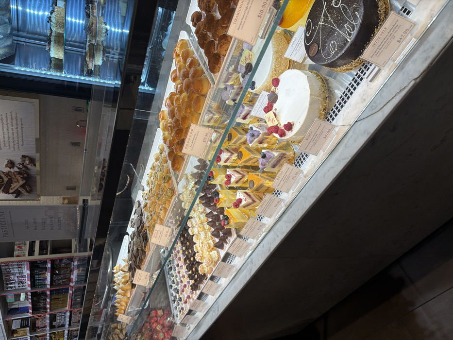 A display case showcases an array of pastries and cakes. "Mini Baba al Rum" is priced at $10.90. Slices of "Mortello" are marked at $10.50. Next to them are the "Tiramichol" cakes. Two round cakes rest in the upper right. One is a plain white "Bianca" with a price of $47.90, and next to it a chocolate cake is the "Sette Vele," also priced at $47.90. Various other pastries, including several with fruit toppings, line the case.