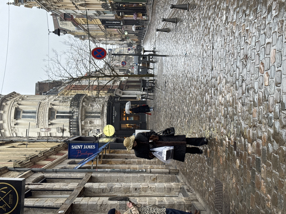 The image depicts a wet cobblestone street scene on an overcast day in Lille, France, specifically on Rue de la Monnaie, facing east. The ground is uniformly paved with wet, reflective cobblestones, indicating recent precipitation. In the immediate foreground, to the left, a person is partially visible, wearing a leopard-print jacket over a blue garment, and dark pants. They are looking down, possibly at a mobile device held in their hands. The central figure in the mid-ground is a person walking away from the camera, wearing a dark, possibly fur-trimmed, long coat, dark pants, and a light-colored, wide-brimmed hat. They are holding a clear plastic shopping bag containing white boxes or items in their left hand and a dark handbag in their right hand. The street is lined with multi-story historic buildings featuring traditional French architecture. On the left, shop signs are visible: a black rectangular sign with "FASHION HAIR CUT" and barber's tools, and a blue banner sign for "SAINT JAMES Boutique." Further down, a prominent corner building on the left features ornate white stone facade, bay windows, and balconies. Below this building, storefronts display signs for "Le Callidrome" (yellow circular sign) and "GLOIN DUCOSSE PARIS" (black storefront). On the right side of the street, more historic buildings with shops are visible, including a "rochebobois" sign in the distance. Several other pedestrians are scattered throughout the scene, some holding white or dark umbrellas, indicative of the rainy conditions. Street furniture includes a streetlamp extending from the right, a red circular 'No Stopping or Parking' sign with a blue 'X' and a supplementary white sign reading "SAUF" (except) positioned roughly in the center of the street. Below it, two dark cylindrical public trash bins are visible. Several black metal bollards line the right edge of the cobblestone street. Outdoor cafe tables and chairs, dark in color, are arranged outside some establishments on both sides of the street. A bare-branched tree stands near the center of the street, between the street sign and the corner building.