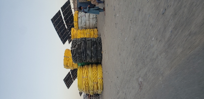 The image captures an outdoor storage or commercial yard in Kandahar, Afghanistan, under a pale, clear sky. The ground consists of uneven, light grey dirt with visible surface impressions, indicative of traffic. In the mid-ground and background, several arrays of dark photovoltaic solar panels are mounted on angled frames, facing upward. The foreground and mid-ground are dominated by large, vertically stacked coils of flexible material. Multiple towering stacks are bright yellow, while a prominent central stack is black. To the far right, a stack of white coiled material is partially visible. Two individuals are present on the right side of the frame: one person, wearing a light blue tunic, stands facing slightly away, appearing to look at an item in their hands or at the ground. A second individual, partially obscured, is seated on a low object, dressed in light brown clothing, positioned near the standing person.