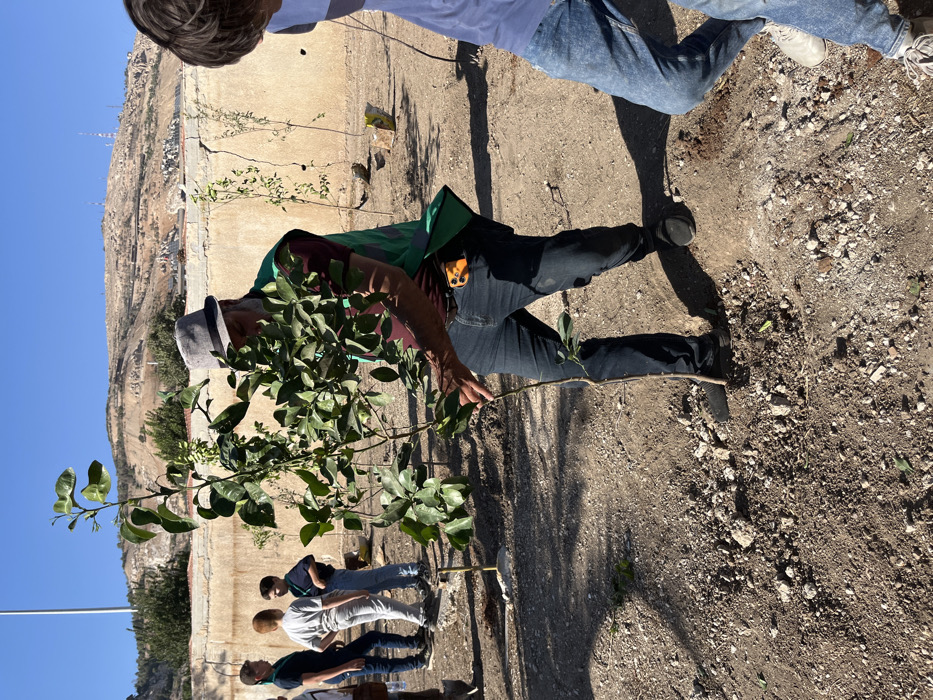 An outdoor scene in Al-Muhajerin Municipality, Syria, depicts a tree planting activity under a clear blue sky