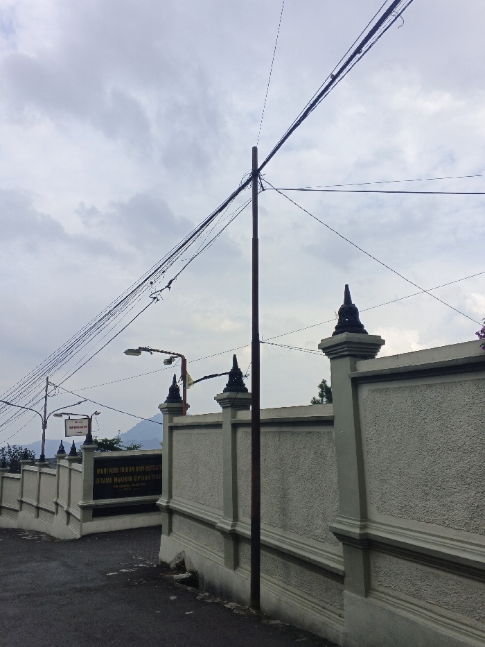 This image depicts an outdoor street scene under an overcast, cloudy sky in Siexiengmai, Laos. In the foreground, a dark asphalt road slopes gently downward from left to right. A light-colored textured perimeter wall with regularly spaced vertical pillars and dark, ornate finials, resembling miniature stupas, extends horizontally across the midground. Mounted on a recessed section of this wall to the left is a dark rectangular sign displaying white text, which reads in Indonesian: "MARI KITA RUKUN DAN BERSATU SESAMA MAKHLUK CIPTAAN TUHAN" (Let us live in harmony and unite as fellow creatures of God). A smaller white sign with the word "PREMIUM" in red is visible above it. A prominent dark utility pole stands slightly right of center, supporting numerous tangled black electrical and communication wires that crisscross the frame against the sky. Another utility pole with a street light and a yellow banner is visible further to the left, positioned above the wall. In the background, green foliage and distant hills or mountains are discernible beneath the cloudy horizon. No individuals or active interactions are present in the scene.