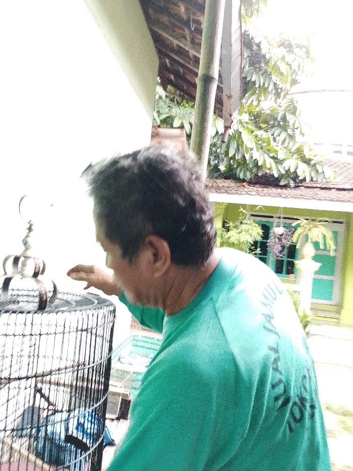 An adult male, viewed from the back and right side, with short, dark, slightly disheveled hair, is positioned in an outdoor residential area in Kecamatan Pati, Indonesia. He wears a teal long-sleeved shirt with the text "JUAL JAMU TOKO" (or similar, partially obscured) printed vertically on the back. His right hand is extended towards the top of a large, dark, cylindrical birdcage with vertical bars and an ornate finial. Inside the cage, a blue fabric or object is visible. To the left of the man is a white wall. Above and behind him, a dark-tiled roof and a vertical bamboo-like pole are present. In the mid-ground, dense green foliage is visible. In the background, a house with a lime green wall and a teal window frame is discernible, featuring hanging potted plants. The scene is brightly lit, with some overexposure in the upper right quadrant.