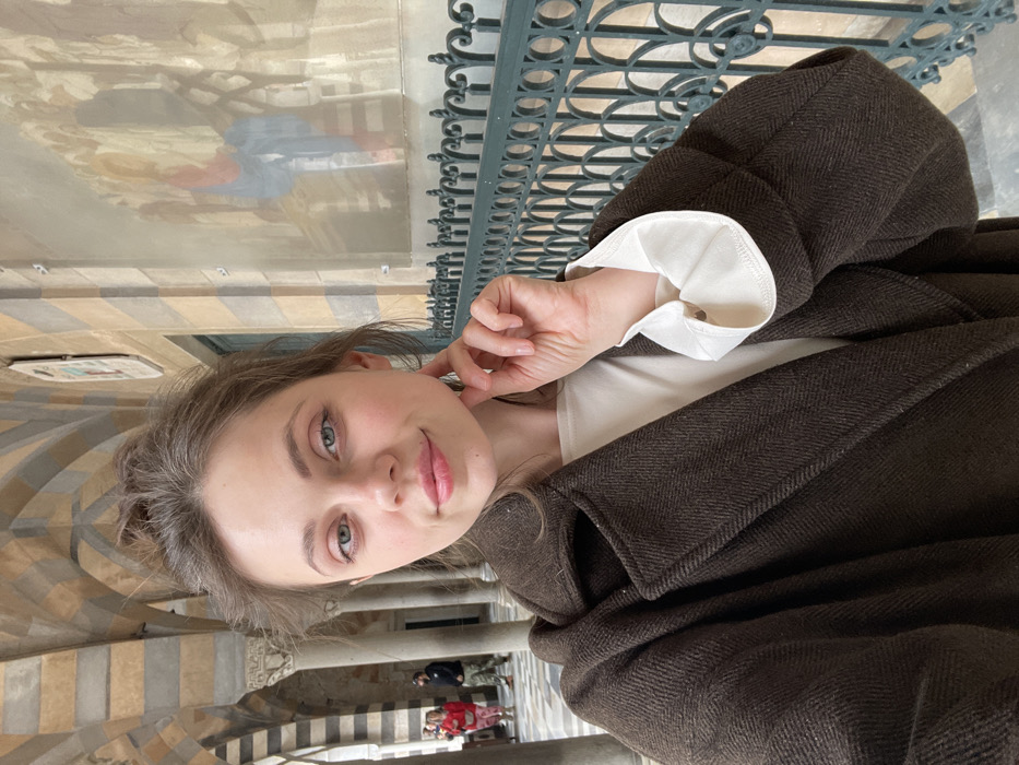 A female subject is depicted in a medium-shot selfie, positioned centrally and looking directly at the camera with a subtle smile. She has light skin, blue-green eyes, and light brown hair styled in an updo. She is wearing a dark brown, herringbone-patterned overcoat with wide lapels, revealing a light cream-colored top underneath with its rolled-up cuffs visible at her wrists. Her right hand is raised, with fingers gently touching her lower jawline/chin. The background features an ornate architectural setting resembling a cloister or covered walkway. The architecture, characterized by alternating light and dark striped arches and slender columns with decorative capitals, is highly indicative of the Duomo di Sant'Andrea (Amalfi Cathedral) in Amalfi, Italy, which is located below the city of Pogerola. To the left, a series of open arches extends into the distance, revealing out-of-focus figures, including a person wearing a red top and pink pants. To the right, a solid wall with matching vertical stripes features a dark green, intricately designed metal railing along its base. Above this railing, a faded mural or fresco depicting multiple figures in various hues is present, with reflections partially obscuring the artwork. The scene is illuminated by ambient natural light.