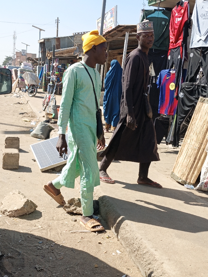 This image depicts an outdoor street or market scene in Gama, Nigeria, under clear daylight conditions. In the foreground, two men are walking from left to right. The man on the left wears a light green long-sleeved tunic and matching trousers, a bright yellow knit beanie, and light brown slide sandals. He carries a black shoulder bag across his body and holds a small, dark object in his right hand. To his right, a second man wears a dark brown long-sleeved tunic and dark trousers, a patterned light-colored cap, and dark red flip-flops. He is positioned slightly behind the first man and appears to be looking towards the viewer. A third person, wearing a dark blue robe, is partially visible between the two men, further back in the midground. The ground consists of a mixture of packed dirt and rough concrete. A small solar panel, approximately 50x30 cm, rests flat on the ground to the left of the man in green. Nearby, a gray sack and several irregular concrete blocks are scattered. To the right, a concrete curb or raised pathway runs parallel to the direction of travel. In the midground and background, various market stalls are visible. On the immediate right, a stall displays multiple items of clothing for sale, including sportswear such as a red football jersey, a blue and red striped jersey with a yellow Spotify logo, a light gray long-sleeved shirt with "QATAR AIRWAYS" text, and a green tracksuit. A rolled-up light brown mat leans against this stall. Further into the background, rudimentary structures with corrugated metal roofs and walls line the street. A bicycle is parked near these structures, and a motorized cart piled high with what appears to be mattresses is visible on the far left. Overhead, utility poles and power lines are present against a clear blue sky. Strong sunlight casts distinct shadows of the figures and objects on the ground.