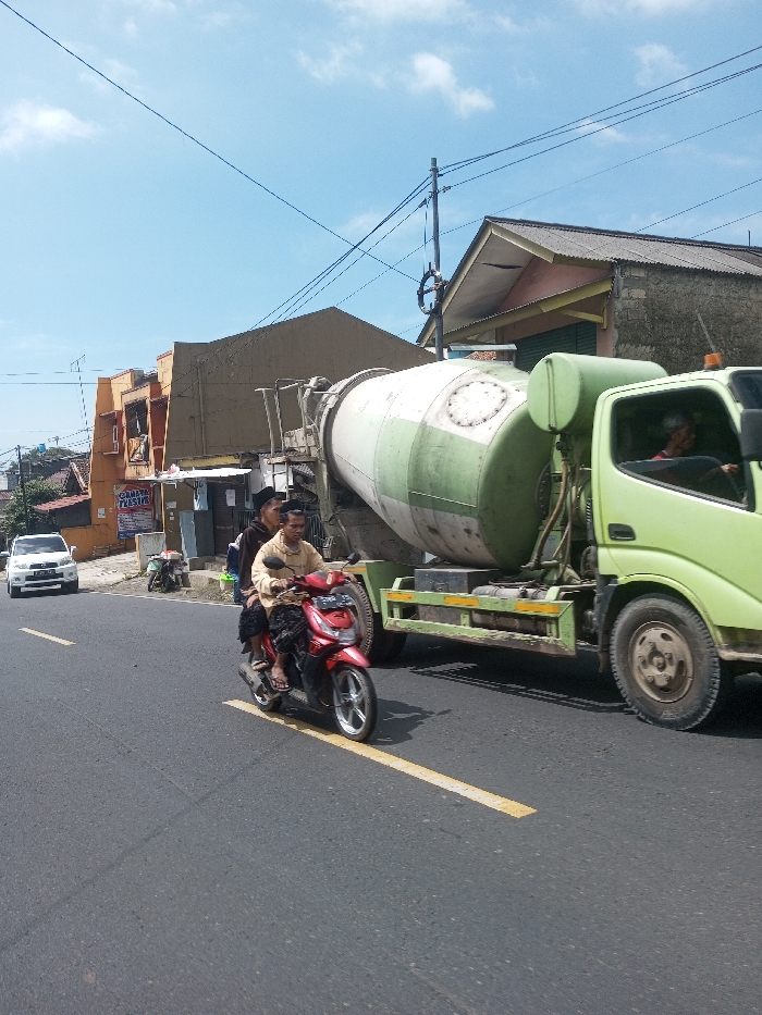 The scene captures a daytime street in Beteng_Pangkhar_Somthrang, Bhutan, under a clear blue sky with scattered clouds. An asphalt road, marked with a solid yellow center line, is occupied by moving vehicles. In the immediate foreground, a red scooter is ridden by two males. The driver, clad in a light-colored long-sleeved shirt and a dark sarong, wears sandals. A male passenger, wearing a dark shirt and a dark cap, sits directly behind the driver. The scooter's license plate partially displays "DK 38". Adjacent to the scooter, on its right, a light-green cement mixer truck with a white and green rotating drum is in motion. The drum exhibits signs of dirt and wear. A male driver, wearing a red shirt, is visible within the truck's cab. Both the scooter and the truck are traveling in the same direction. On the left side of the road, a white SUV is either parked or stationary, facing the viewer. Its license plate begins with "DK". Behind the SUV, a multi-story building with an orange-brown exterior features several windows and balconies. A partially visible sign on its lower level reads "GALBA PLASTIK". Further along this side of the road, additional buildings are discernible. On the right side of the road, parallel to the truck, stands a single-story building with rough-textured, unpainted walls, topped by a light-colored corrugated roof with yellow trim. A dark utility pole, fitted with a circular electrical component and multiple overhead wires, is positioned next to this building, extending across the upper portion of the frame.