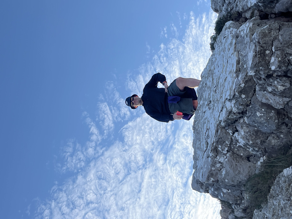 A person stands on a rocky precipice against a partly cloudy blue sky